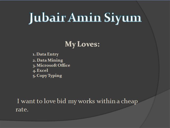 I am skilled in Data Entry,Data Mining,Excel,MS Word and Copy Typing works. Please give me the opportunity to show my perfection at these sectors.